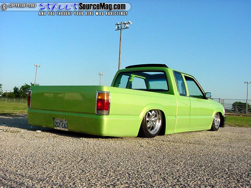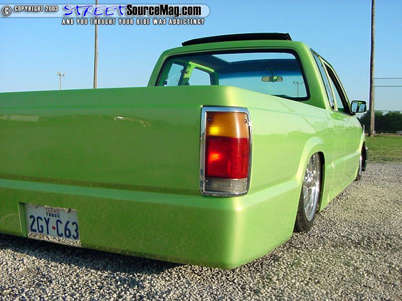 Along with all this bodywork Jim also welded the tailgate shut and molded the top of the bed in except for the front section where you can find the compressors and air tank for the air ride and the gas filler neck. To add to all this badass bodywork Jim yanked the front grill and bumper off and replaced them with a FBI billet insert and a Toyota 4x4 front bumper. With the body prepped and primed it was time for some paint, the color of choice for this amazing Mazda would be Dupont