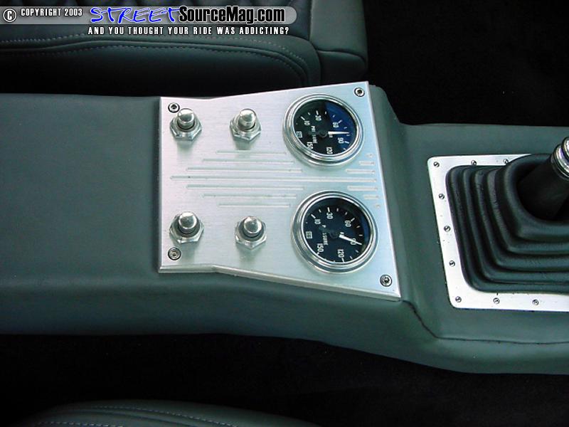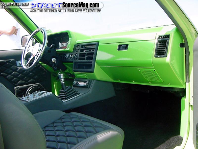 antifreeze green kandy which was sprayed by Jim also. Now that the exterior was brought to life it was time to move on to the interior and spice it up a bit. On the interior Lonnie kept the theme of green rollin on to the inside, he pulled every piece of plastic he could and slapped it with the matching antifreeze green. Along with all this paint Lonnie built a custom console and door panels that Player Custom Interiors of Hockley, Texas wrapped in black and gray leather.