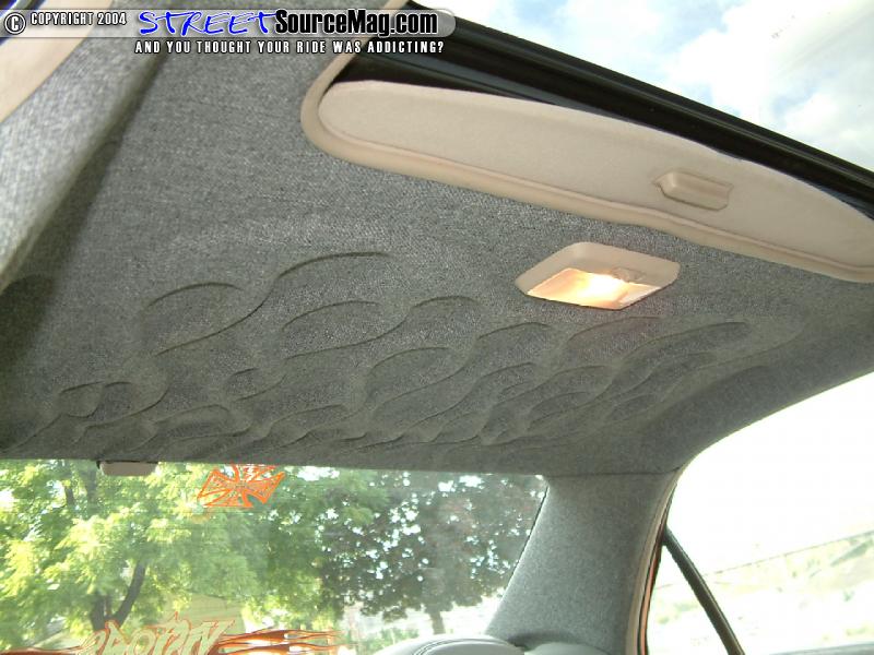 With the smooth sweet exterior, Tanya would have Jason next get down on the interior, his specialty. For starters the dash would be wrapped in tweed while the control panel would be shaved and the vents painted to match the exterior. The door panels would then be housed with half tweed and half paint to help pull the exterior feel into the interior. The headliner would also be applied with the same gray tweed with flames embossed for that extra custom look.