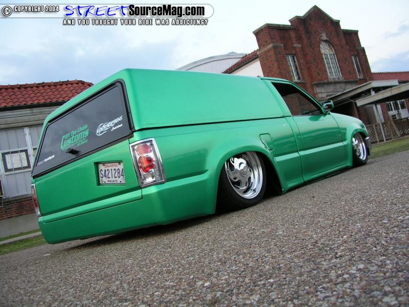 Once the body was looking straight Jimmy would then drop his truck off with a local shop to bag it and set the frame on the ground. After a year of nothing but issues Jimmy decided that dragging frame just wasn’t going to cut it and he wanted to plant the rockers firmly on the ground instead. So with a call to Off the Chain Customs in Jackson, MS the Mazda would soon be sporting a new body dragging stance.  The crew at Off the Chain decided that a 3” body drop was just what the Mazda needed, so with sawzall and welder in hand the body was firmly planted on the shop floor. After giving the previous bag job a once over it was decided that it would need to be rebagged also. So Off the Chain rebagged the front using Firestone 2500 bags with relocated radius arms to allow proper clearance. Out back a new 4 link was installed along with 2600 Firestone bags. For air on-demand 2 Viar 450s were plumbed thru (2) 3-gallon tanks keeping everything below the bed floor. Boyd Coddington Coddzilla would be Jimmy’s wheel of choice wrapped with 215/45/17 Kumho skins.