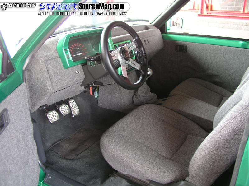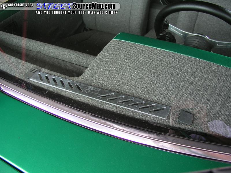 To make the seats match Josh at Leather Trim in Fort Worth, TX was called upon to wrap the stock buckets in gray tweed but minus the headrest. To add accent to the dash Jimmy had several items painted to match the Planet Green exterior hue.