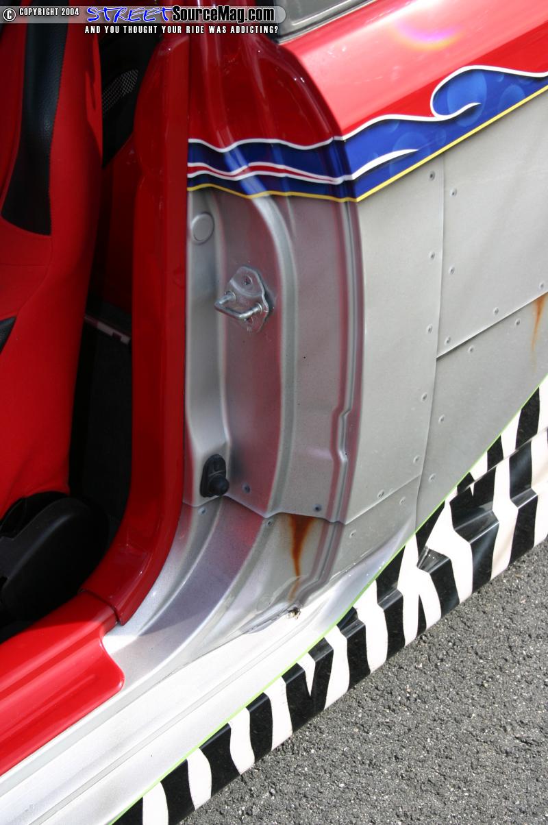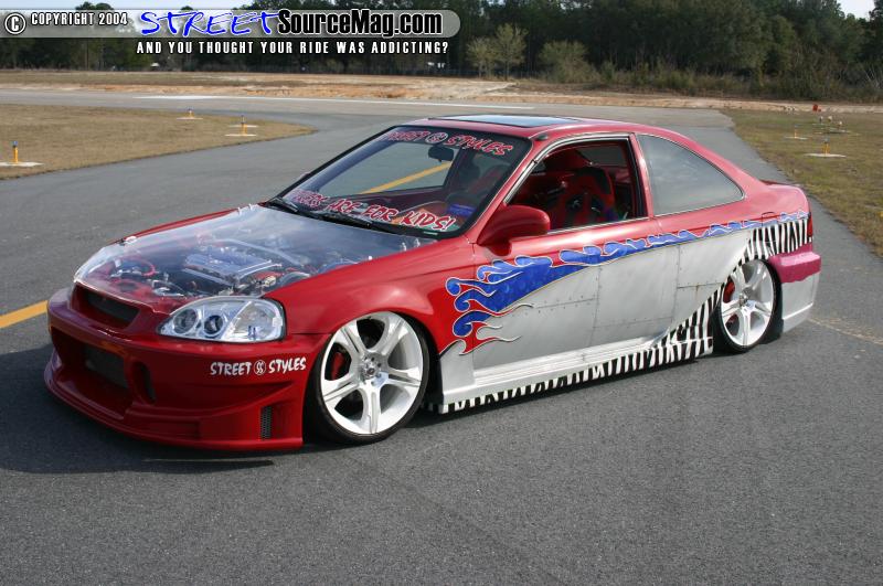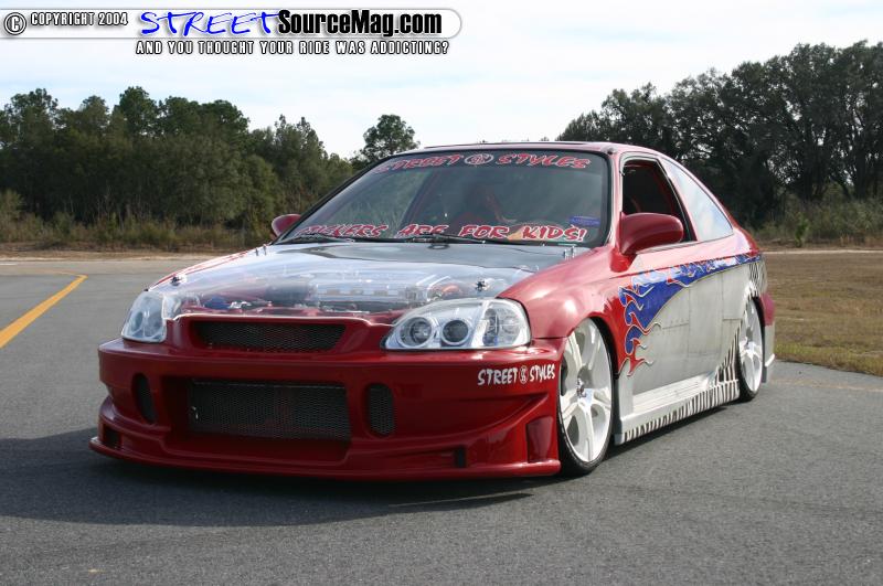 The body kit was then molded to the body of the car and the real bodywork was started. Next Street Styles would shave off the side moldings, door handles, and flush the license plate into the trunk to give it a cleaner look. With all the major bodywork done it was then time for Gary and Donnie Novak to come up with a crazy paint job to finish the exterior off. The Civic sat in the booth prepped and ready for paint while Milano Red was mixed up for a base coat.