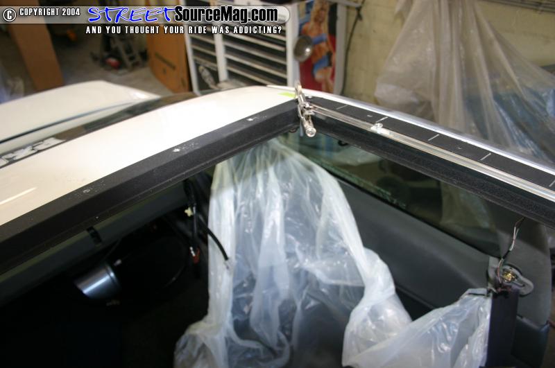 Since I work at a body shop that often uses silicon sealants we decided to use heavy-duty window and panel sealer used for sealing windows in cars and body panels. We spread a ½” thick bead around the area where the rag top frame is going to rest. Be prepared for a mess when you are doing this, I suggest you have some rags and lacquer thinner/cleaner close by. You will need a couple people to lift the ragtop into the hole. First make sure that the hole for the rag top lock is in the front. Lower the frame assembly into the hole and squeeze it tight to the roof being careful not to dent it. We used heavy duty C clamps to hold the frame tight to the roof, be careful not to make them to tight because you may dent the roof around the frame. We clamped the frame down on both sides and the front and back. We waited approx. 2 hours before we began any drilling. The silicon that is being squeezed out will take you a decent amount of time to clean up. After we were all cleaned up we cleared the silicon out of the holes so that the studs could be pushed through. Tighten the studs all around the roof by pushing the studs into the holes and using the washers and nuts from underneath. Be careful not to over tighten any of the studs. Next you can silicon around the inside of the studs if you feel the need to go the extra mile.