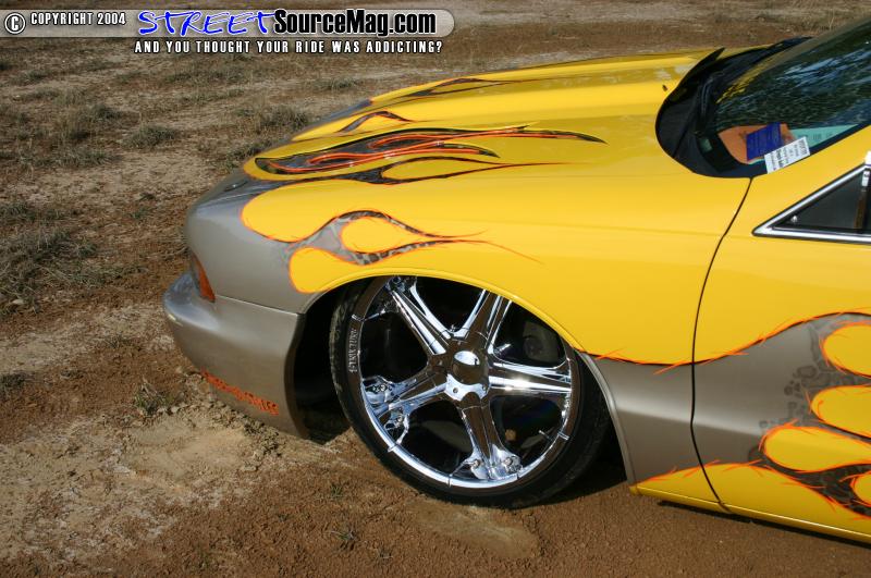 With all of the bodywork complete and the fabrication over it was now time for Jason and Gary Young at Street Styles to lay down some paint. Gold flames start off in the front which fade into Giraffe print graphics, these are followed by Dupont yellow which flows into the doors and quarters and has a flame graphic at the end, the color then goes into a dark blue which was accented with ghosted skull graphics. The car was then cleared and buffed to perfection.