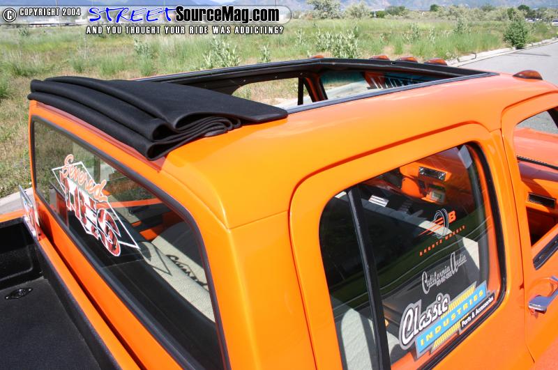 A Trenz billet grille was bolted up in the front along with H4 headlights. Out back a smooth roll pan was molded in. On to paint, Ron would have Eric Bostain at Trick Kustoms lay down the Tangerine Candy PPG paint over a white base and spray on a few nice coats of clear. Although some might not agree, keeping the door handles and mirrors would prove to be a great decision on Ron’s part.
