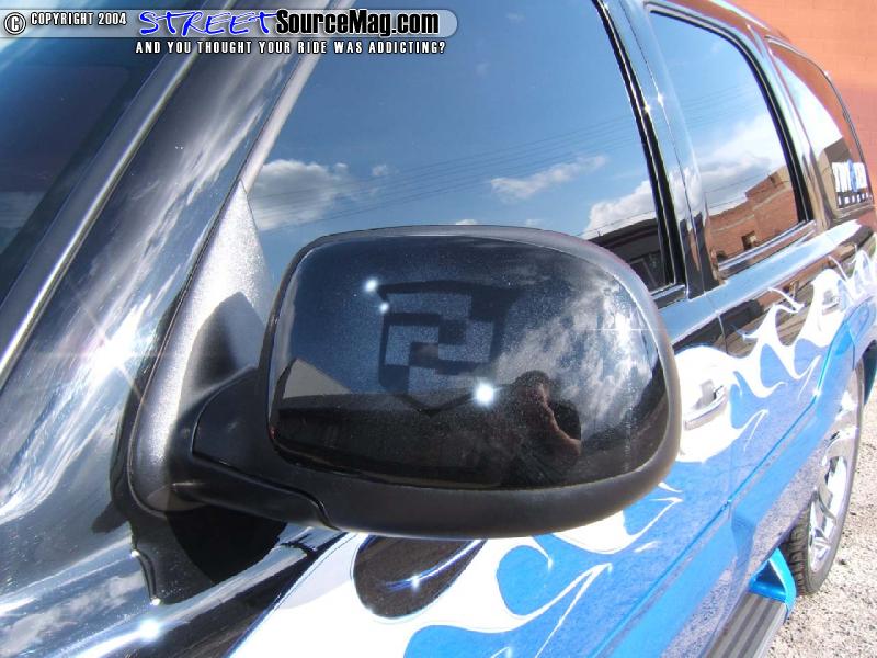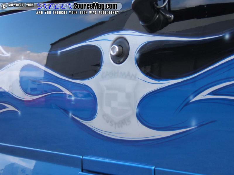 James, first two toned the truck by adding Blue to the top half and then used a silver flame to break up the two tone and add a little flair. But masking and laying down paint is not what Cashman is known for, it’s his airbrushing and he sure did a number adding Caddy logos all over Mike’s ride. It only took James 7 weeks to work his magic, and then the Escalade was loaded on the only trailer it has been on for a show and taken to Vegas for the SEMA show.