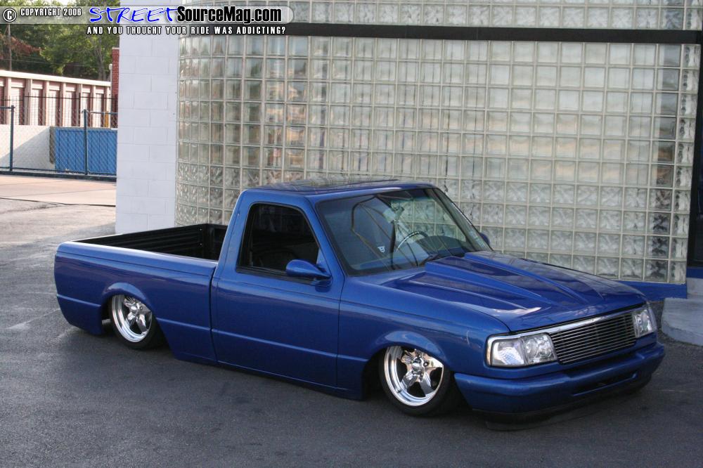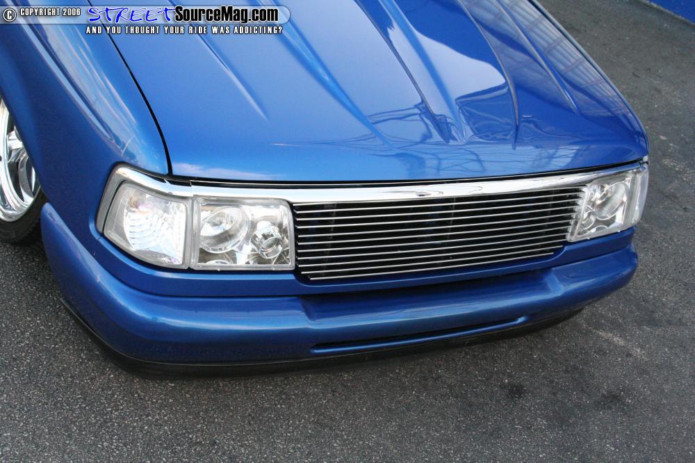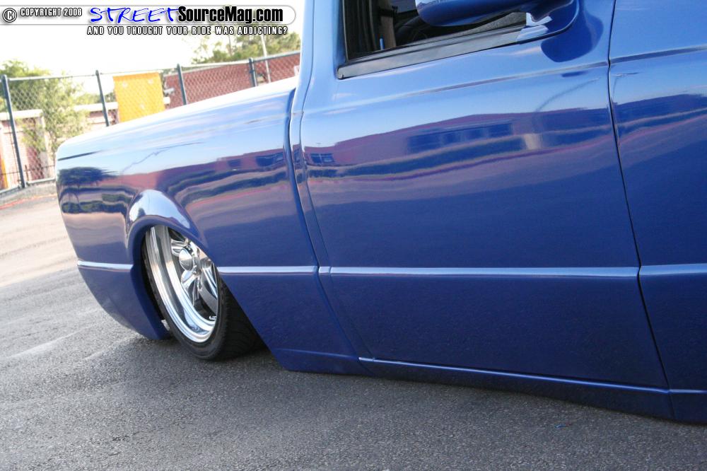 The factory hood was not going to work with the bodydrop so a cowl hood was bolted in its place and the stock hood became a piece of the past never to be seen again. Stock mirrors are for stock trucks, says Tyler so his were ditched in favor for M3 style units. The front end is not lacking the misuse of factory parts as the grille was swapped for a billet version, the headlights are now projector style and the corner lights are clear.