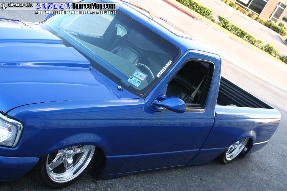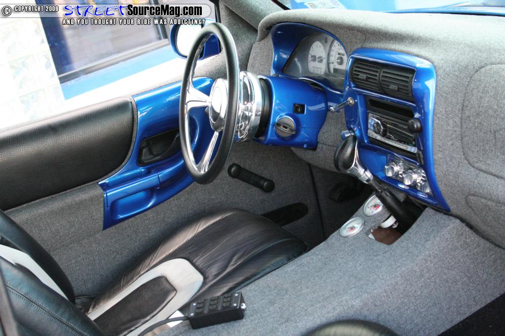 Blinding the driver on those sunny afternoons is executed by the Billet Specialties steering wheel, billet rear view mirror and billet shifter knob. The factory seats were chopped to a smaller size and covered with black leather and silver ostrich hides. A custom console was made to house the air gauges with a space for the shifter to peak through and was covered in grey tweed. Keeping the factory style carpet was not a hard task with the stock floor bodydrop and center console covering the center that was modified to fit over the transmission and driveshaft tunnels.