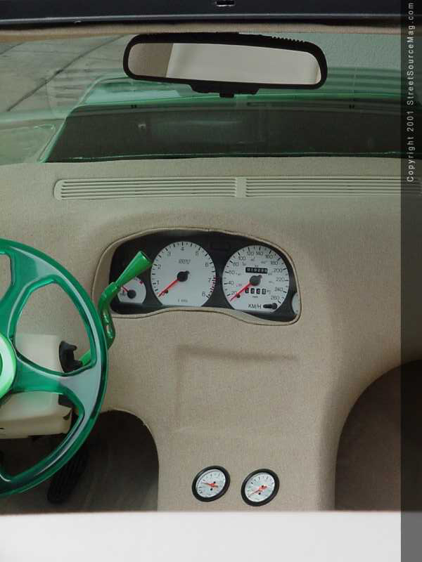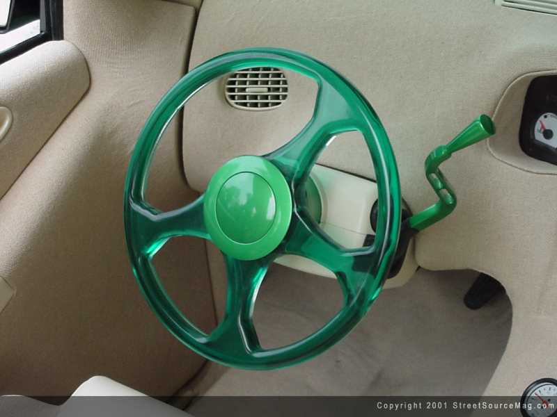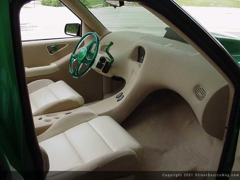 Then, everything was wrapped in sand tweed and vinyl. To finish off the interior, a custom green Plexiglass steering wheel was installed along with a CD player for some rolling tunes.