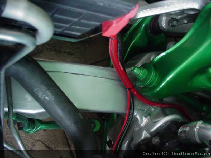 Next, the firewall was smoothed and painted. The factory 4.3 was cleaned and painted green and silver. In addition, Taylor plug wires, Edelbrock headers and a K&N filter was added. To bring it all together, a Flexalite dual 12 inch electric fan was added. To get the deep throat sound, Matt decided to go with a 3” Dynomax muffler and the exhaust was applied with a Ceramic finish. The engine wiring harness was also modified to clean up the engine.