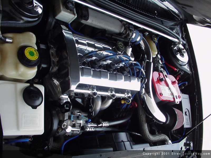 It took a ton of phone calls, e-mails and shipments of different springs to get the correct suspension set up. What he ended up with was Carrera coilovers. The coilovers have a 300lb rating on each front corner and 275 in the rears. Now that the rims where tucking it was time to stiffin the Saturn up. With that, a SPS 3-way adjustable anti-sway bar was installed along with an SPS front strut brace. Since Dennis had some knowledge in fabricating, he decided to fabricate his own rear strut brace to stiffin up the rear. To help the stopping ability, KVR front brakes were utilized. Now knowing that he wanted to lean towards the performance side of the scene, Dennis started looking into building up the engine. Starting with the 1.9 liter engine, a set of vitek wires, hot shot header ceramic coated were installed and 2 5/8ths inch piping from the cat back along with a Borla muffler were added to smoothen out the sound. Now that the engine was open for breathing, Dennis found himself adding a Hotshot intake, and JG throttle body. To bring some eye candy to the engine, Dennis decided to polish the valve cover.
