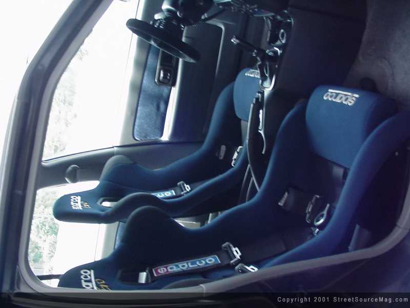 With everything complete except for the interior and stereo, Dennis turned to his friend Tim of Dropworks in Fredericksburg, VA. Tim spent a lot of time in the car welding and measuring out the seat brackets to bolt up the Sparco EVO seats. With the seats now bolted in, the interior was set up with velour inserts which were stitched by Keys Upholstery. The next step would be to remove the stock steering wheel and seatbelts and replace them with products provided by Sparco.