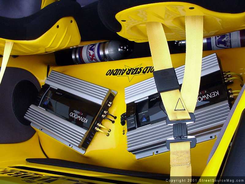 Kenwood high end and mid range speakers are installed around the interior along with a molded fiberglass custom sub box ported into the cab. Scosche EFX wires were used to bring the sound alive. The custom amp rack and subwoofer box was smoothed and color matched by Wet Works Garage. Roberts '01 Spyder was built to help promote Modern Image Sign Works and all the people and products that are on the car. The car was done in just 9 weeks of time to be debuted at the 2000 SEMA show in Las Vegas, Nevada. You can also see some of Robert and Modern Image's vinyl work in this summers hit movie "The Fast and the Furious"