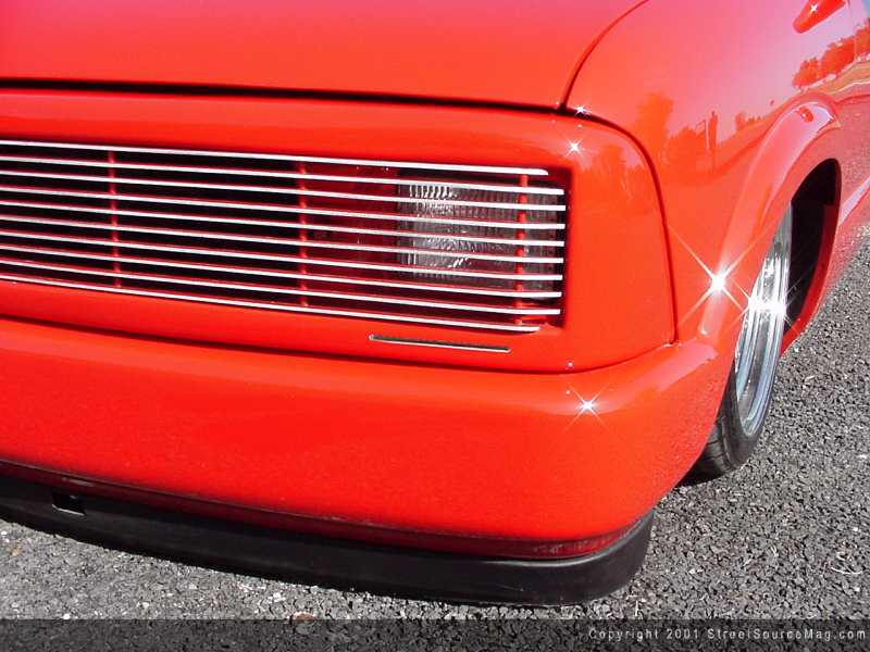 With the cab touched up, the front clip was all that awaited the customizing skills of Pats Auto. The front is where the unique modifications reside. With the custom grille with billet inserts bolted up, the front blinkers would be cut and molded into the grille shell itself with LEDs. Next the crew at Pats Auto molded the shortened 94 full-size Chevy front bumper to the fenders.