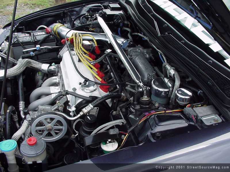 Under the hood, you'll find a very clean and tidy engine compartment, housing the stock 2.2 liter four cylinder. The valve cover has been powder coated as well as the strut tower brace and Reactive plug wires were installed to give the Honda better spark. Allowing the Honda to breathe a little nicer, Jason installed a custom dual exhaust system, using a DC Sports header, 2" exhaust pipe and Reactive muffler, giving the Honda a sports car tone. A Reactive air intake system lets the air enter the engine better, while a NOS 80 Shot Dry Fogger system boosts the Hondas power well over stock. Inside, you'll find a B&M short throw shift kit, which allows Jason to go through the gears quickly without missing a single beat. Jason's top speed to date in his clean Honda is 150 MPH.