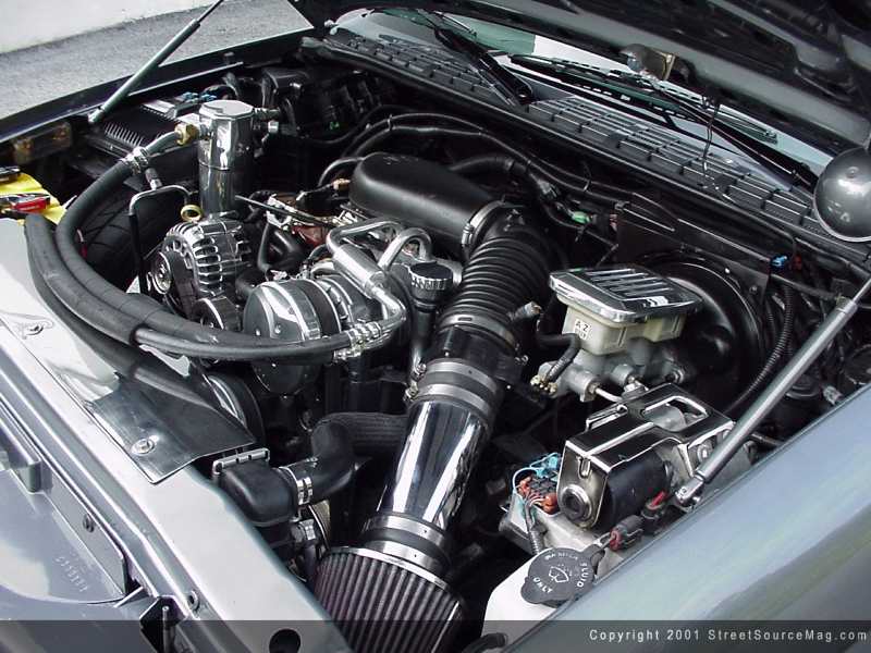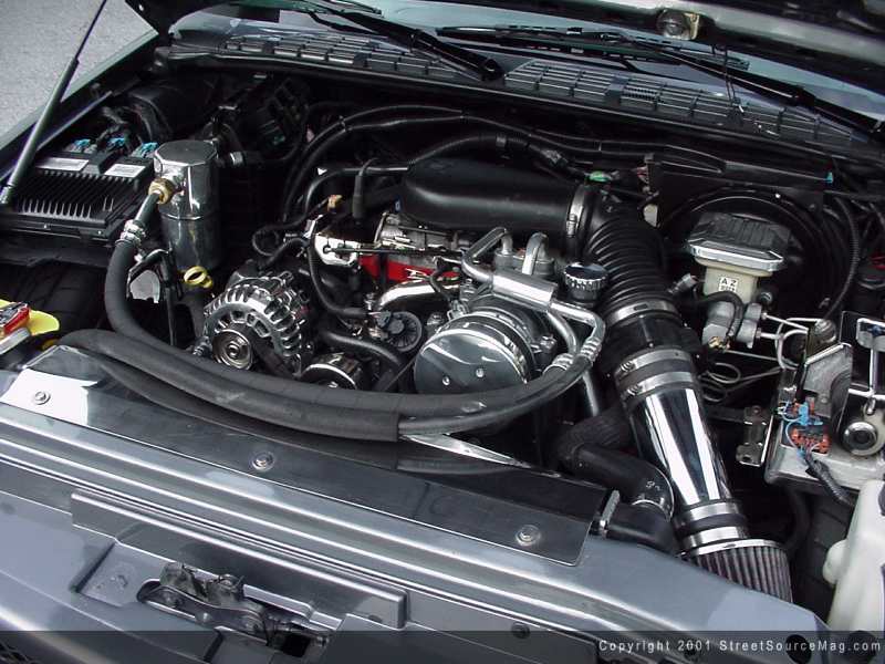 Rick's truck was obviously headed for stardom, but he still wasn't finished with his beast. Under the hood needed some love and attention as well, so Rick tore things apart to add the necessary dress-up that's needed to win shows. First Rick had a massive amount of items chromed including the ABS bracket, water neck, idler pulley, power steering pulley and both throttle cable brackets. Next on Rick's list were the items that he would polish out to a high gloss shine including the oil and radiator caps, A/C clutch cover, master cylinder cover, A/C lines, alternator, belt tensioner and all mounting hardware. Chrome and polished parts and pieces don't look good unless you compliment them with painted pieces as well, so Rick painted the A/C compressor, A/C and alternator engine brackets and the power steering filler tube. Rick not being able to leave well enough alone decided a few items also needed to be added to give his stock 4.3 liter V6 a little more "get up and go." First, Rick installed a TBI spacer and GMS mass airflow sensor.