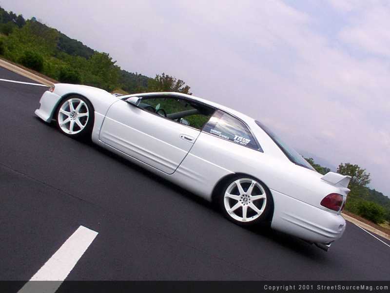 Most of the dash and console pieces have been painted white and a carbon fiber dash kit has been installed. A Euro dash and white face gauges out of an Eclipse has been made to fit as well as the addition of a few billet interior pieces, like a rear view mirror and pedals.