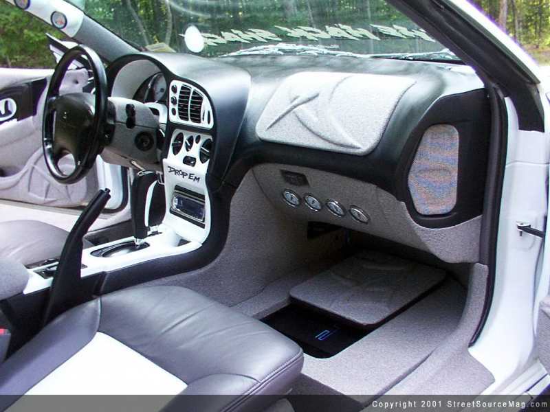 Once you've taken in the entire exterior, your eyes move to the full out custom interior. All three seats have been wrapped in gray leather with white inserts. The rest of the interior you'll find several yards of gray and black tweed in the company of tribal graphics in everything from the dash to the rear deck lid.