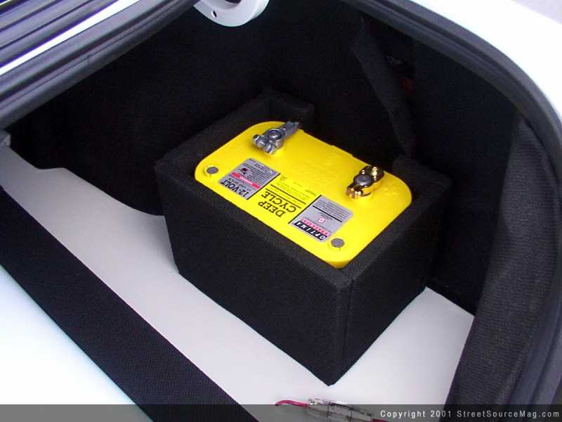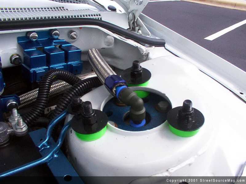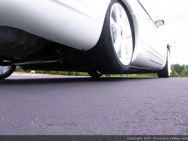 Making sure the Sebring would have a round-hugging stance, Scott decided to use a full air cylinder set up. This was done by using 6" cylinders from Blow Jax on all four corners. The entire air system is controlled by a 10-switch box with the addition of 2 reverse valves used to "suck" the rear wheels into the fender wells for a standing dogleg.