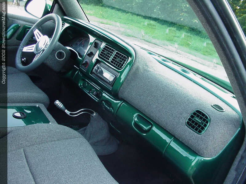 Knowing that he couldn't compete in the show scene with out interior Ryan went to town on the inside of his Dakota. Starting with the Dash, Ryan decided to smooth it out, paint it along with tweeding the door panels. The headliner would then be tweeded to match along with other tweed and painted panels.