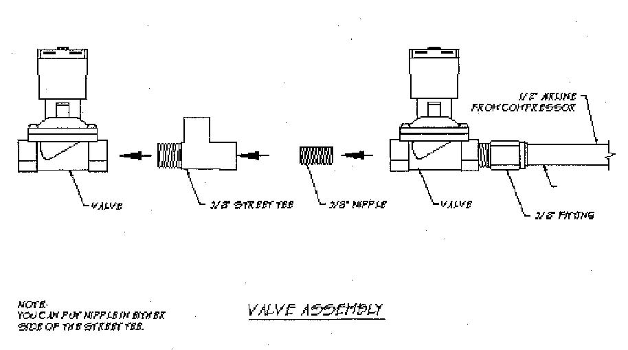 7. Refer to wiring diagram for the final wiring of the Parker valves, relay and compressors.200 PSI pressure switch wiring:Relay 30- To 12 volt power (to battery) 85- Ground to Chassis 86- Blue on PSI switch 87- Red on compressorPressure Switch Blue to 86 on relay Red (DO NOT USE) Purple to ignition 12 volt powerCompressor Red to 87 on relay Black to Chassis groundWiringF.B.S.S AssemblyValve Assembly
