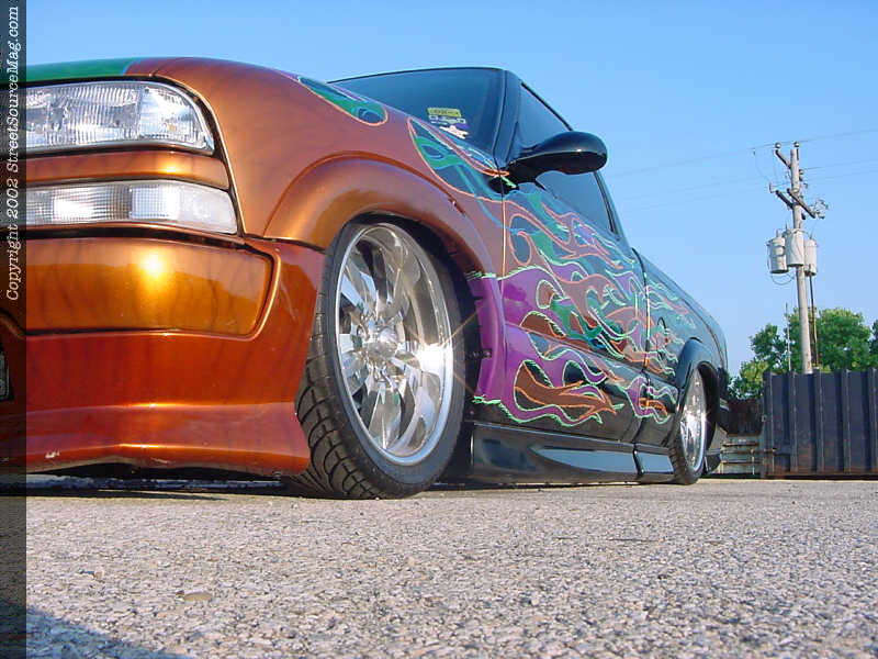 Cody showed the truck like this for a while taking home several trophies before he realized that to make a big impact he needed to be closer to mother earth. So it was back to Kevin at Kreative Colors to give the truck the more modern stance. Up front Kevin relocated the KYB shocks and replaced the springs for firestone 2500lbs airbags. Outback Kevin super notched the frame and junked the factory leaf springs and replaced them with a 2-link, a adjustable pan hard, a set of 2600lbs airbags and KYB shocks to dampen the ride. Now that the truck was sitting on the ground all Kevin needed to do is get it back up. Getting the truck up quick is not a problem when you are using ½ ASCO red hat valves, ½ lines and one big tank of nitrogen. Moving to the interior Cody kept the same concept as the outside by painting a lot of flames on the any thing plastic he could find and adding all of the billet pieces that was available for his Xtreme. For tunes Cody had Joe Mendoza wire up his Sony Xplode head unit, eclipse mids/highs, Orion 400 watt amp and his set of Fosgate 10" subwoofers.
