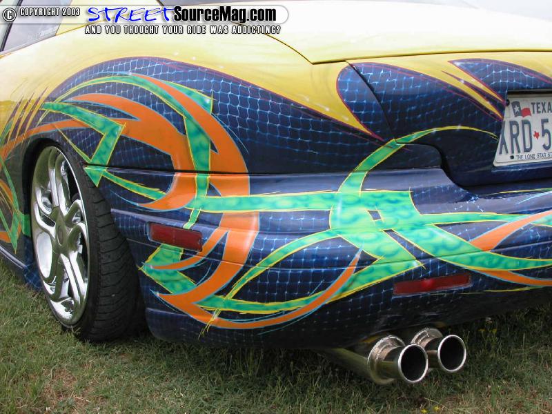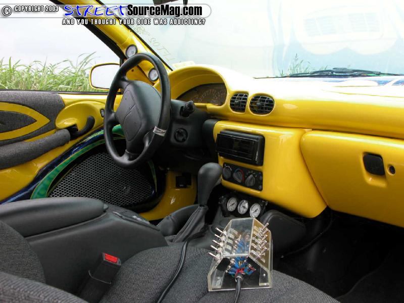 After starting there, Silvey continued to make mods throughout the interior. Again with help of friends and Pat Read, Chris rolled the graphics of the exterior into the custom door panels and dash. He also added the custom air gauges into the pillar of the Sunfire for an even more dramatic effect.