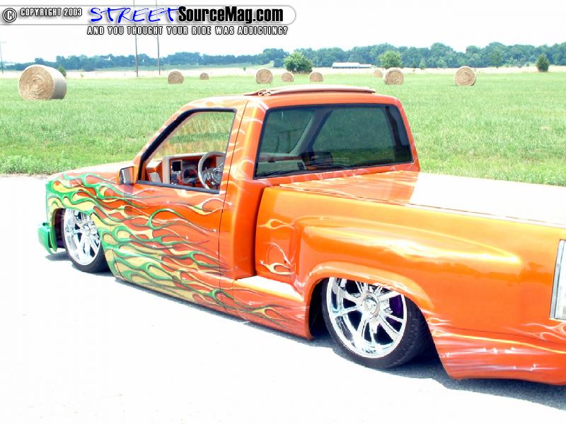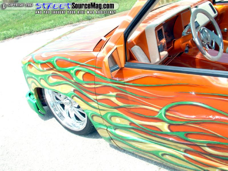 With the body complete, Ike would take the Chevy to Scott Shopp of Fat Cat Customs of Manford, OK. While in Scott's hands a Tangerine House of Kolor paint would be laid down. Needing more attention form show goers, Scott would then lay down a set of Planet Green and lime gold flames pinstriped in Passion Purple and Indigo Blue. Ike was now closer to what he had envisioned that very day he had bought this project.