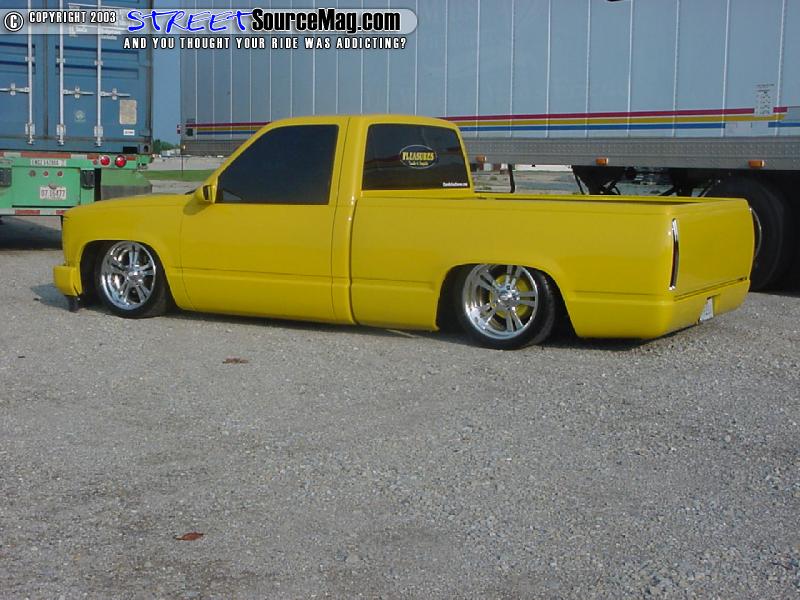 Before the competition yellow was laid down Brian welded up the door handles and antennae hole and ditched the factory taillights in exchange for a set of 98' caddy lights. To add to the exterior Kyle also ditched the factory "elephant ear" mirrors for a set of Street Scene mirrors and added a full phantom billet grill up front.