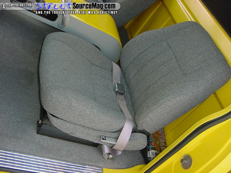 For seats Kyle grabbed the first pair of "junk-yard specials" he could find and had Greg's upholstery stitch them up in gray tweed. Along with the seats and dash Greg smoothed out the door panels and headliner and wrapped them in matching vinyl.