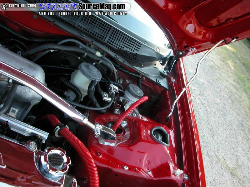 Finally, Steven turned his attention to the engine bay. Here he chromed the A/C condenser brackets, the hood hinges, the power steering mount, and the master brake cylinder. He used all polished stainless steel nuts and bolts throughout the engine bay, upgraded to a chrome air intake and filter, rerouted most of the wiring for a cleaner look, and added a chrome strut bar for stability. He also worked in a DC Sports header, which leads to a chrome down pipe and an APEXI muffler.