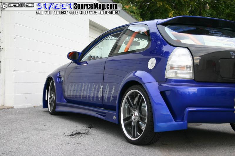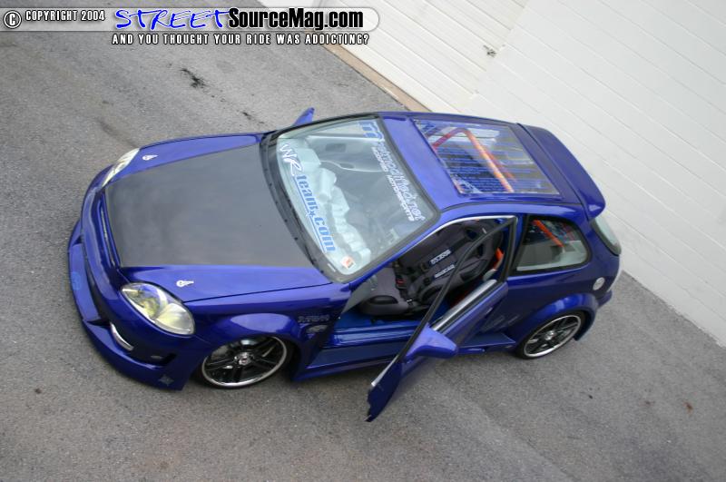shaved gas door with a Sparco gas door molded in its place, custom metal fenders, a fully molded wide body kit, and a shaved antenna there were only a few things Dave wanted to change.   First would be to remove the ragtop that he didn’t particularly care for and replace it with a lexan piece to give him one big moon roof. Satisfied with that, Dave then installed a carbon fiber hood and hatch, and while he had the hatch off a set of clear taillights was swapped in.