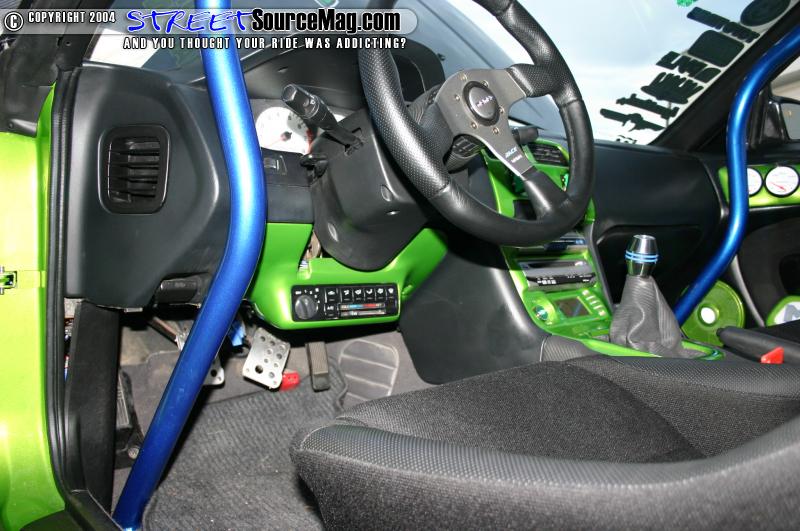 Upon opening the doors a Cusco 6-point roll cage greats you along with the Momo Steering wheel equipped with Tekniq Autosports snap-off system and Momo hub adapter. The interior also houses Nismo S15 floor mats, Sparco racing seats with harnesses, Stewart Warner gauges, Veilside titanium shift knob, Veilside titanium pedals, a custom center console, and a mad carbon shifter boot.