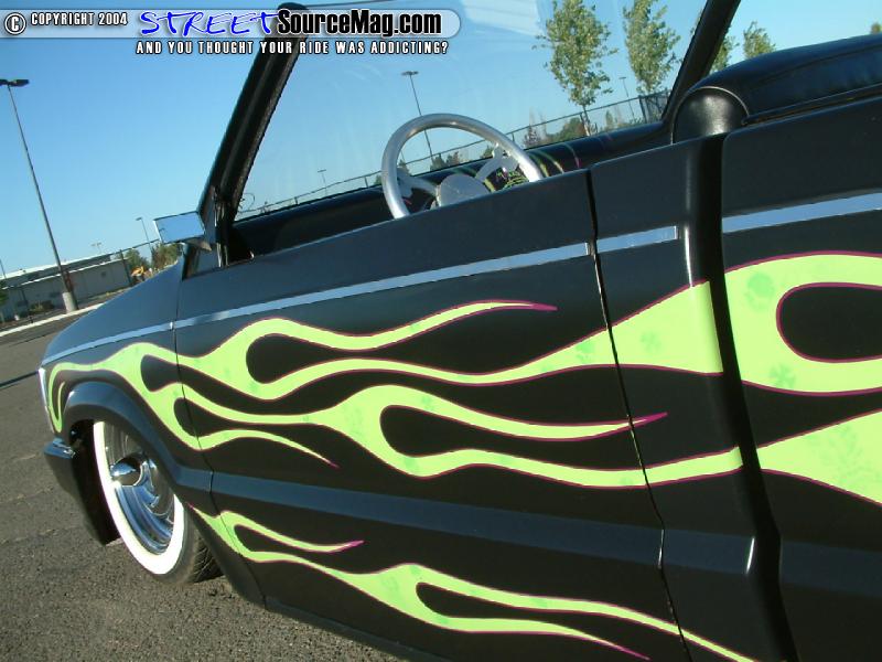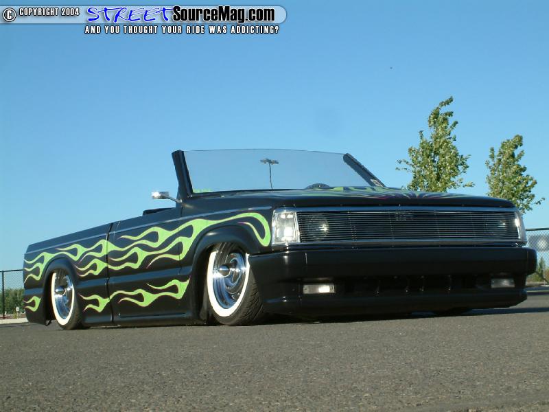 Behind the grille Chris would install a set of 72 GMC truck headlights replacing the stock Mazda headlights. Next Chris would install the stock Mazda bumper with filled plate holes and factory chrome trim. The door handles would then be shaved along with the gas filler door.