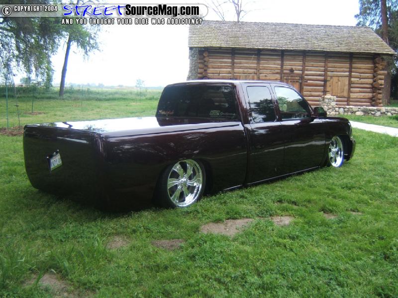 To replace the taillights he upgraded to a set of AVS L.E.D. taillights and molded the license plate box into the area where the tailgate-use to reside. He then converted the nose of the truck to that of a Caddilac Escalade and added a Gaylords Tonneau cover to give the truck it’s sleek look. Next the truck was fully sprayed in a kandy House of Kolor Brandywine.