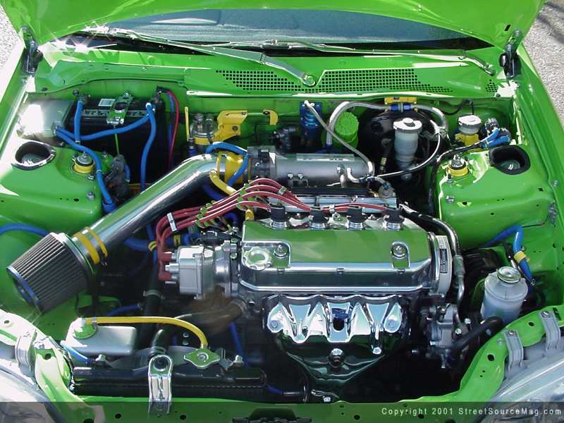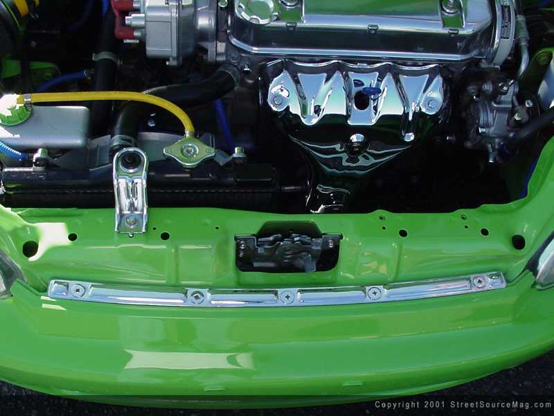 | Sporting 18x7 Konig Caffine’s wrapped in 215/35/18 Nitto 450’s. | To finish off any best of show vehilce, it was time to get the engine up to par with the rest of the car. To manage this, Jason had many parts chromed out and painted. Along with those items, he installed a RS Akimoto intake with 2 ½” cat back exhaust to allow the engine to breath.  To get appropriate fuel mixed in with the air, Jason purchased a Stillen fuel pressure riser along with Magnecore plug wires to provide the spark.