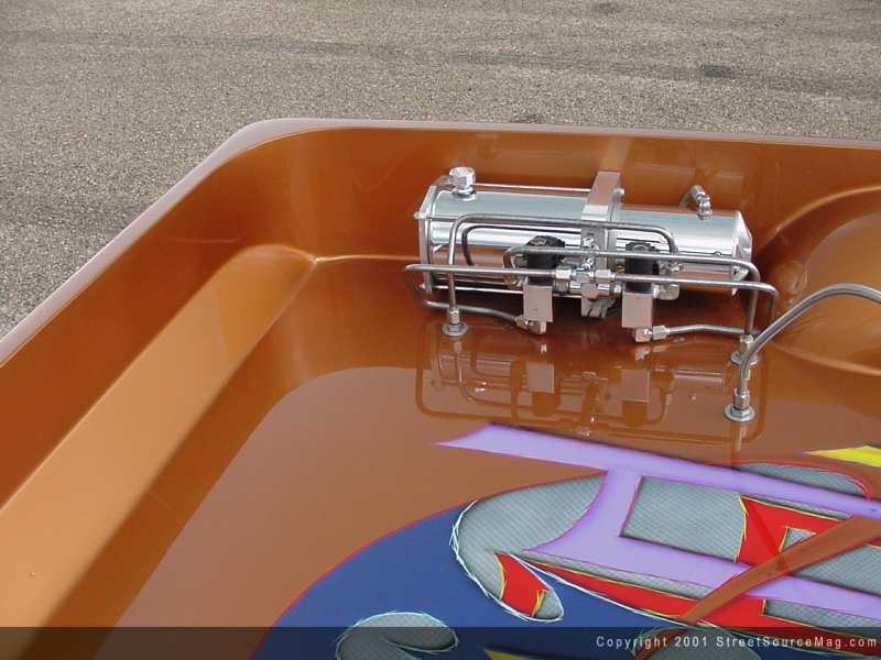 The tailgate was then welded shut, the taillights shaved and replaced with Hagan rod wear tail lights. Next a Sir Micheals roll pan was welded in and the license plate box was molded at an angle in the stock taillight location. At this point the truck was nearly complete on the outside. A PPG Saphron Gold paint was added to finish the outer looks.