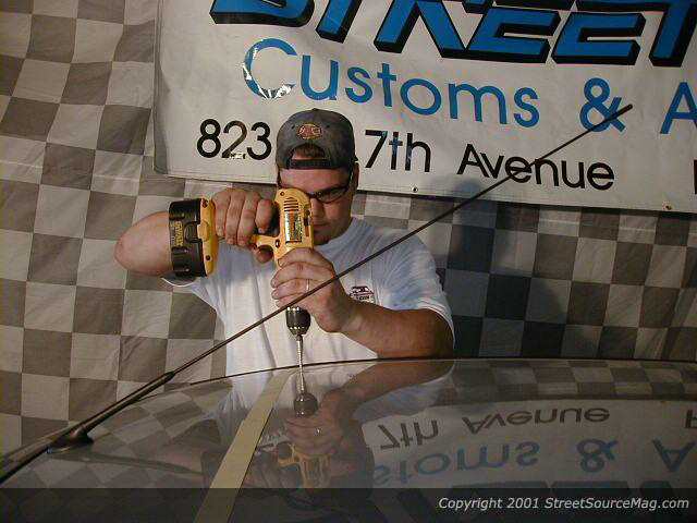 Step 8: Using tape as a guideline, mark out the area you will be cutting. Using the tape helps keep the paint from getting damaged in the cutting process. Step 9: Using a Unibit, John starts the process by opening up a hole in the corner. The rounded edges also help keep the roof from having problems later. The hole he is making is also to ease in the nibbler we will be using to cut the roof.