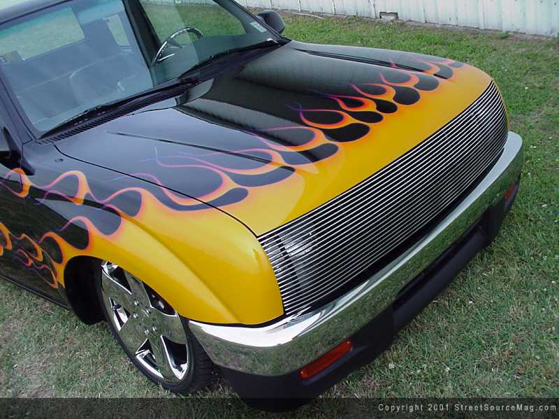 Next, Heather dropped her truck off at Ronnie's Custom Refinishing in Grenada, Mississippi, where Ronnie Boatman finished the body work by shaving the squirters, door handles and tailgate handle.  | The clean set of flames led your eyes to where the handles used to reside. | From there, an Alter Images roll pan was installed to give the rear end a smoother look as well. Finishing off the rear end is a set of taillights from a 2001 Tacoma. Up front, Ronnie installed a chrome 4x4 bumper and valance from a '97 Tacoma and then recessed the headlights to accommodate the Trenz polished phantom grille. Ronnie also installed a set of 2001 rear view mirrors.