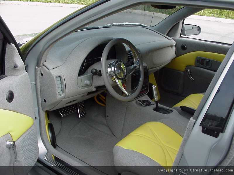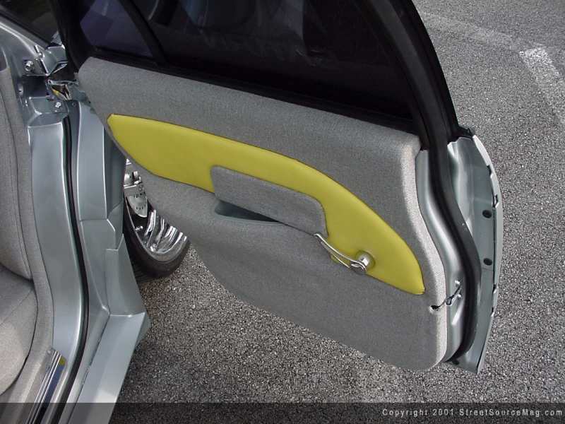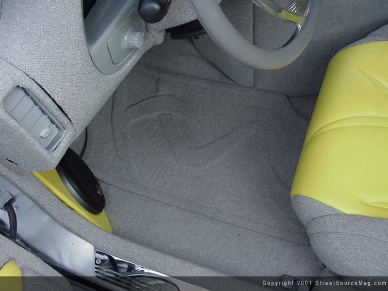 Keeping with the stock seats, Geoff turned to Dan from Custom Covers in Lebanon, TN for his professional assistance. While in Dan's hands, the seats would be wrapped in a two-tone gray tweed and yellow leather pattern. With all of the panels covered one way or another including the new floor material, there would be various billet items customized to fit, found within the interior. A chrome shifter along with a set of race pedals would be added for viewing pleasures.