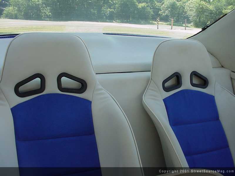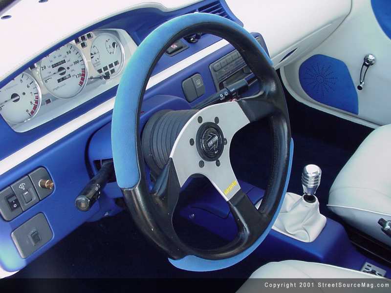 Keeping the front of the cab at a top custom level, the steering wheel was replaced with one from MOMO along with the install of a billet rearview mirror.  The gauges would then be removed in favor for a set of white face gauges and all of the vents where then dyed blue. Accompanying the new racing seats would be a set of Tenzo-R racing harnesses. But the custom interior wouldn't stop there; the rear deck would be removed of the 3rd brake along with the speaker pods and wrapped.