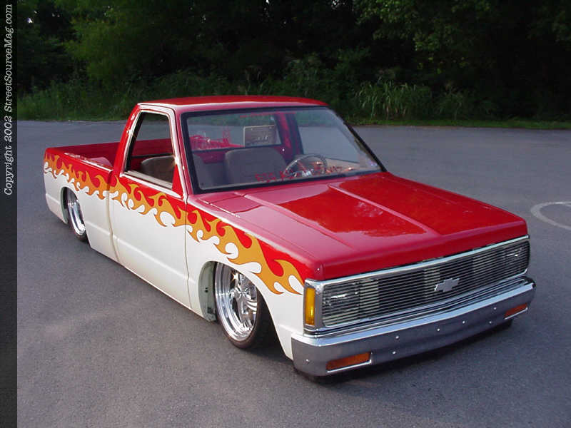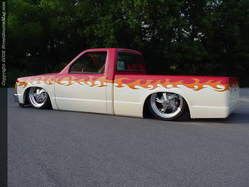 Jimmy also removed all emblems, shaved the body line, tailgate handle and taillights. Ten inch neon tubes custom mounted in the rear shine down and reflect off of the body, acting as taillights on the S-10 now. To top things off, Les installed phantom grille shell from F.B.I. and then called upon Mitch Kennedy and Denny Phillips of Meridian, Mississippi for paint duties.