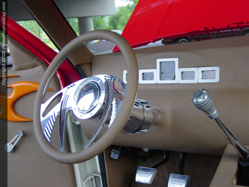 The headliner, and various other panels were removed and wrapped to match also. Les also ditched the factory steering wheel and column and replaced them with billet models from Billet Specialties. He also installed Billet Specialties pedals.