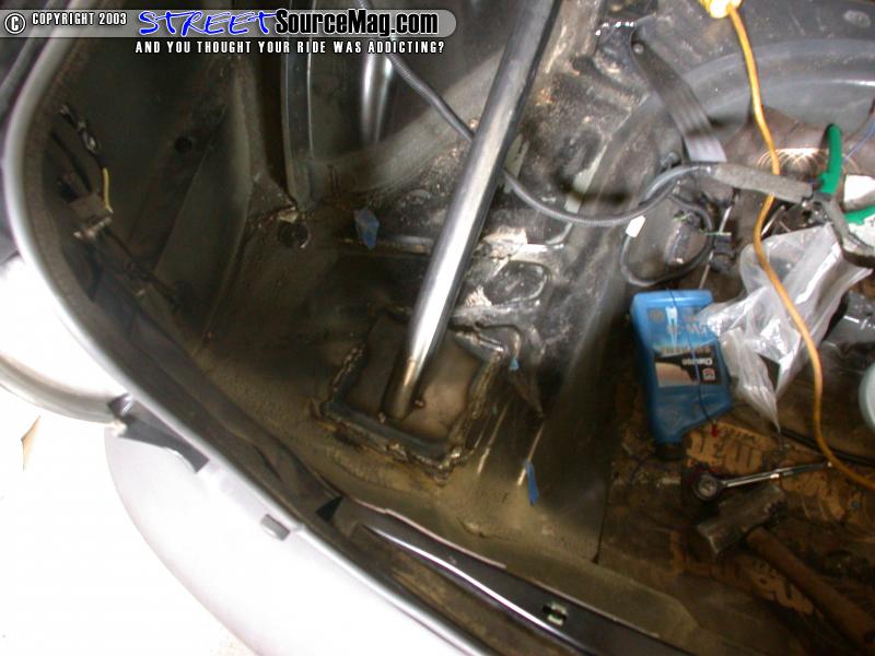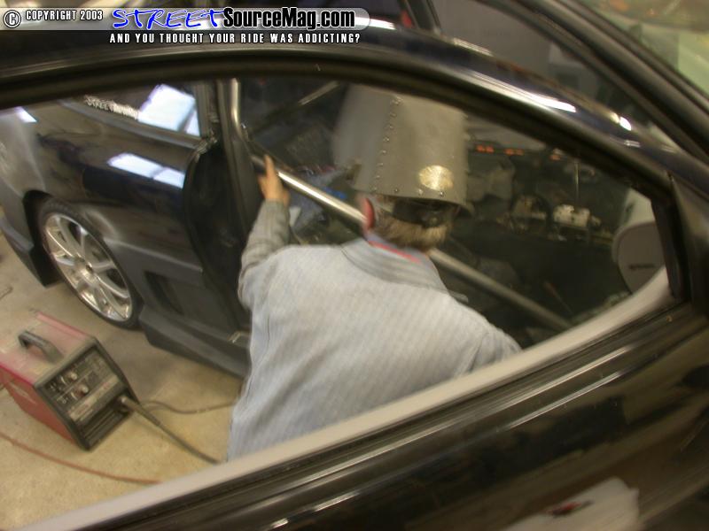 Next comes the seat cross member. After you determine the height at which you will mount it, test fit it in place against the main hoop. It may be a good idea to test fit the frame supports and door braces at the same time. Once that is done, mark where these will be placed and trim as necessary for proper fit. Tack weld the seat cross member in place. Next, we need to install the floor plates for the door braces. We recommend positioning them so they mount on the strongest area of the floor possible. We chose to do it on the lower part of the firewall where the unibody frame rails were. Weld the floor plates in place. The floor plates up front required a lot of grinding to the floor because of a ton of sound deadening/glue type material sprayed over the surface. We removed it so we had a clean metal surface to weld on.