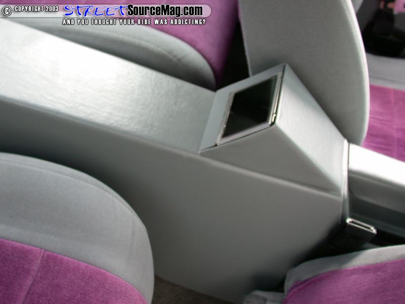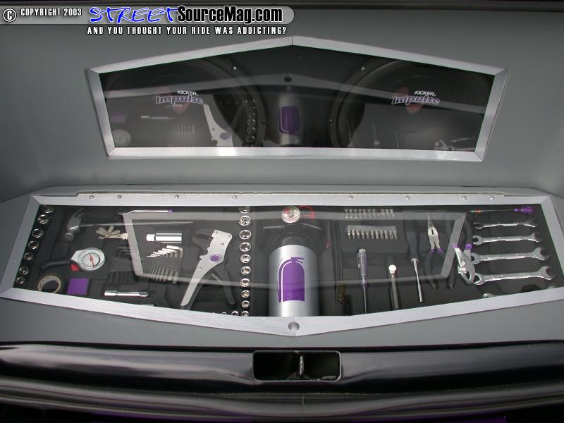 Feeling his stock GM CD player would work well with his needs, the would just install a Pioneer EQ to help adjust the sounds. The Sony amplifiers that help push the speaker set up would then be painted purple to match the exterior.  You will also find a 7.2-inch monitor in the dash with a DVD player in the glove box. A 5-inch TV monitor is also located into the rear of the center console.