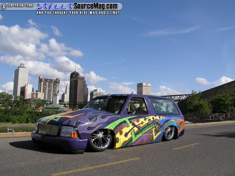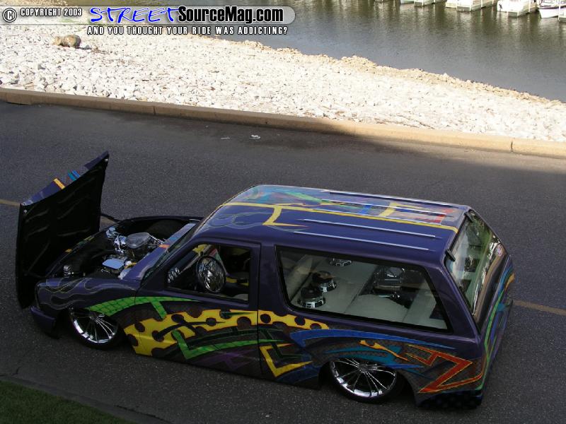 With all the body mods complete William went back over the truck priming and blocking it until every imperfection was removed and the shiny stuff could be applied. House of Colors purple was then spayed onto the smoothed firewall, the underside of the cab and the entire body of the lil Blazer. This is were the majority of people would have quite and called it done but there was no way that was going to happen so William added a combination of diamond plate, cheddar cheese, flames, slash and alien skin graphics in a variety of hues from HOK that flowed from the body on thru the door jams.