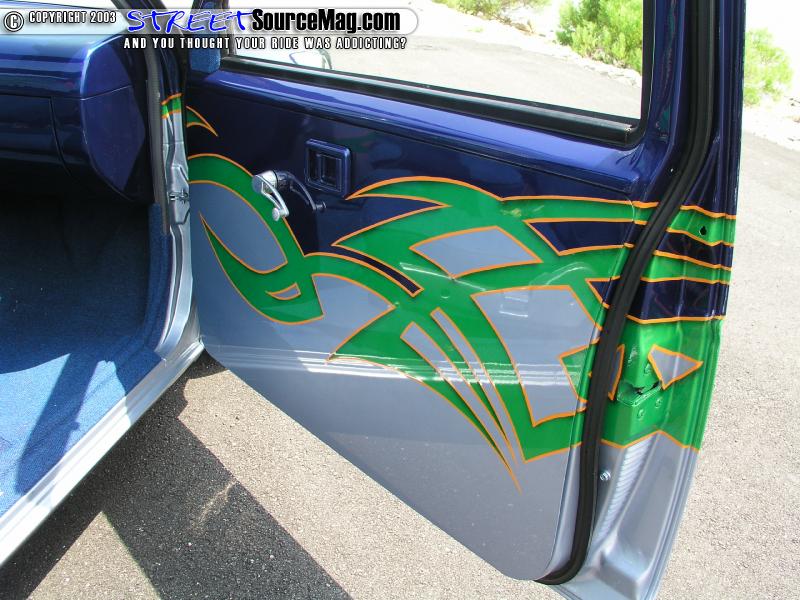 Wanting the graphics scheme to flow into the interior Chad's Dad cut custom metal door panels and then treated them to the same matching graphics designs that adorn the exterior. Once the dash and door panels were in place a Colorado Customs Wild Horse billet steering wheel was installed. The factory bench seat was replaced with donors from a Pathfinder but only without the headrest. Juan's Upholstery in Pearl, MS then covered the seats and floor with Sherpia Blue tweed.