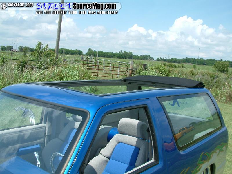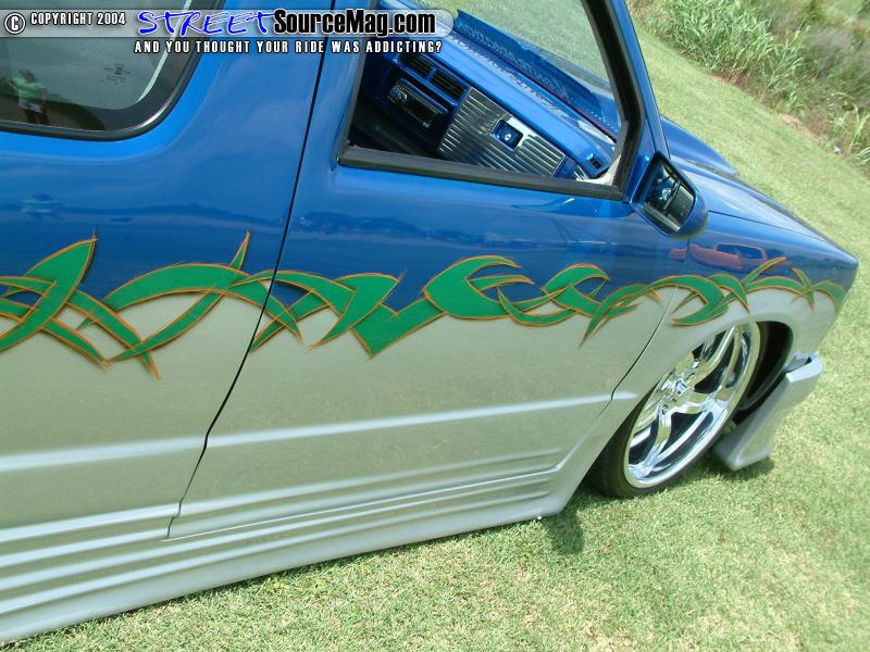 The body lines, emblems, antenna, wipers, tailgate handle and roof rack would all be shaved while a set of ground effects would be molded to the body. Flush mount LED’s would be installed for turn signals in the front bumper while a 67”x40” Street Beat sliding ragtop occupies the roof. Brian with help from Jay Lucey would take on all of the bodywork.