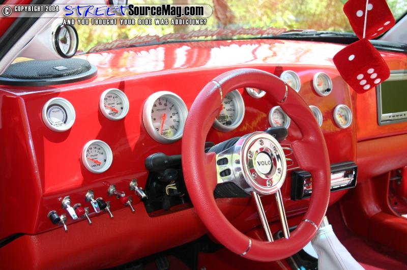 The interior of the car features two-tone leather seats in red/white. The headrests are fitted with TV’s. The roof is also wrapped. The dash was fiber glassed and Stewart Warner gauges were mounted in it. A TV was also fitted into the passenger side of the dash. A steering wheel was bolted up with a red leather trim. The trunk features a fiberglass enclosure with subs in it.