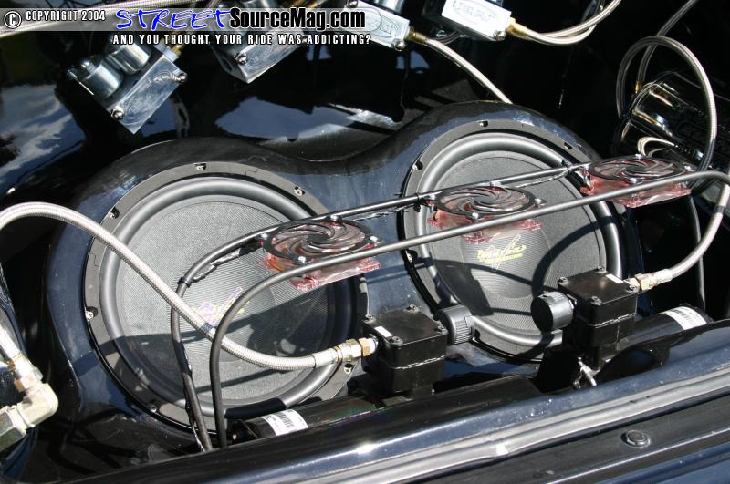 The car rolls on a set of 19” Chrome wheels wrapped in low profile tires, and man are those things shiny! It was also fitted with air ride, and raises and drops courtesy of EAI air valves.  The interior has some painted pieces, and the trunk has a custom-built fiberglass enclosure built by Dirty housing 2 Phoenix Gold subs, which appear to be 12’s.